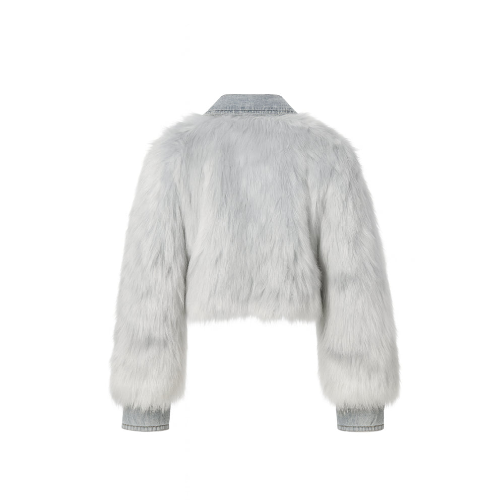 Denimin serin tonu ile yumuşak, kürk etkili dokunun buluşması; sıcaklıkla lüksün şiirini aynı anda fısıldar.